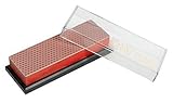 This particular whetstone is encrusted with a fine diamond grit of 600 mesh to put a razor-sharp edge on any type of blade. The surface should be moistened before sharpening and the blade should be passed over the whetstone with light pressure at a 20-degree angle to get the proper edge without dulling it. After sharpening, the whetstone may simply be wiped off and its nonporous properties prevent water from seeping below the surface.