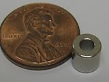 Rare earth magnets are the strongest type of permanent magnet currently made. They are amazingly powerful for their size and have innumerable uses. These ring magnets have an outside diameter of 1/4 inch (0.25) x an inside diameter of 1/8 inch (0.125) x a thickness of 1/4 inch (0.25). They are composed of grade 42 neodymium iron boron magnetic material and are plated in nickel-copper-nickel for a shiny corrosion resistant finish. Their individual pull force is approximately 5 lbs.