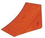 Bright orange for greater visibility. Incoming and outgoing drivers can easily see chock for added safety. Safety tread on chock face provides better grip and reduces slippage. Chock measures 8" width by 8" height by 11" depth.