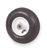 Pneumatic Wheel, Commercial and Industrial,Tubeless Type, Wheel Width 3.63 In, Tire Thickness 3.5 In, Tire Rim Dia 6.64 In, Sawtooth Tread, Symmetrical Hub Type, 4 Ply, Outside Dia 12.5 In, Capacity 445 Lb, Hub Width 4 1/2 In, Fits Axle 3/4 In, Ball Bearings, Tread Color Black, Core Color Silver/Gray