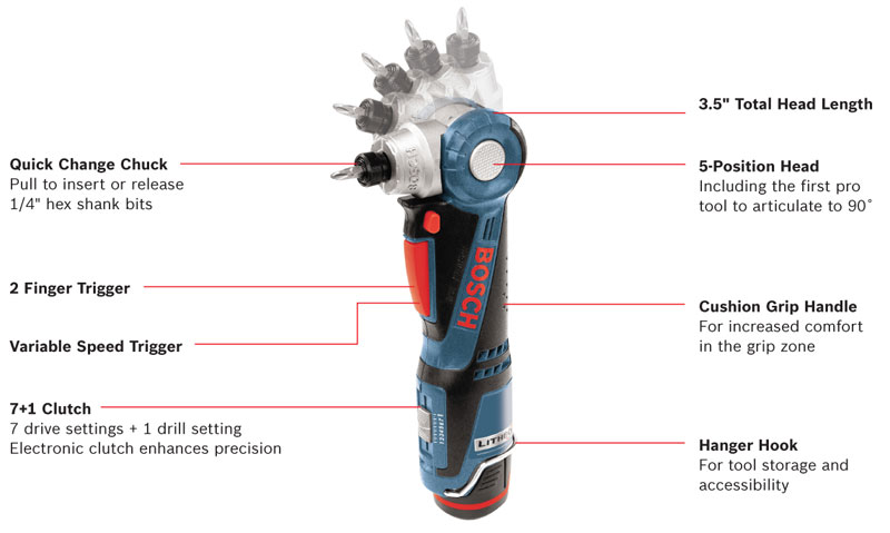 We'd wager there have been plenty of times you tried to maneuver a drill/driver into a spot that just wouldn't allow it and wished you had a small, powerful tool that would drive a screw where others just can't go. Here it is. The PS10-2A is one of the handiest, most powerful little drivers we've laid hands on. It's impressively powered by "litheon," which Bosch calls "the industry's most advanced lithium-ion battery technology." We can attest that there's absolutely no lag in power, and the run time is great; more than 100 drives per charge. Recharge time is just 30 minutes, so you should never have to wait for a battery. The best feature, of course, is the clever design. Instead of a pistol grip like most drivers, this one has a sturdy tool body and an articulating head that has five detents, letting you set it however you need it. The head itself is just 3-1/2-inches long, so it's no struggle at all to slip it into tight spaces suchas in between studs, under-sink cabinets, between joists and other tricky situations. If it's length you need, just flip the head to the vertical position and it's literally like having a screwdriver at your fingertips; it's not quite a-foot long at its full length. It uses 1/4-inch hex bits, and they're easy to change. We would have liked to see some on-board bit storage, but that's a small point. The two-finger trigger is comfortable, and it's quite sensitive, so take care not to strip your fasteners while you're on the learning curve. In all, we're really pleased with this little driver, and we think there's a place for it in just about every toolbox. Includes: tool, (1) carrying case, (2) 12-volt batteries, (1) 30-minute charger, (2) 1.5-inch drive bits.