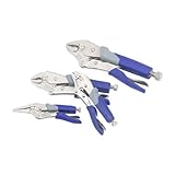 Includes: 6.5 inch long nose locking pliers, 5 inch curved jaw locking pliers, 7 inch curved jaw locking pliers, 10 inch curved jaw locking pliers. Chrome Vanadium Jaws for Extra Strength. Instant Lock and Release Lever. Ergonomic Anti-Slip Handles. Hardness Meets or Exceeds ANSI standards