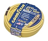 From do-it-yourself, to professional, to industrial applications, Goodyear delivers. 100% made and assembled in the USA, the Goodyear Rubber Air Hose is built to perform and backed by an industry-leading 10 year guarantee. Specially-formulated rubber construction meets RMA Class "C" oil resistance and exceeds RMA 4:1 safety factory (burst/working pressure ratio). With a broad -40 F to 190 F working temperature range, it works comfortably and remains flexible in the toughest environments. Protected by the abrasion-resistant outer jacket, the internal spiral synthetic yarn reinforces the hose wall, preventing splitting or bubbling at high pressures and temperatures. Only solid brass end fittings are used to ensure tight, leak-free connections. End caps prevent hose damage when not in use. Two bend-restricting sleeves guard against kinking near fittings that can choke off air flow or damage hose.10 YEAR GUARANTEE. Specifications: Diameter: 3/8 in., Length: 100 ft., Fittings: 1/4 in. NPT (M), Max. Working Pressure: 250 PSI, Working Temp. Range: -40 to 190 F